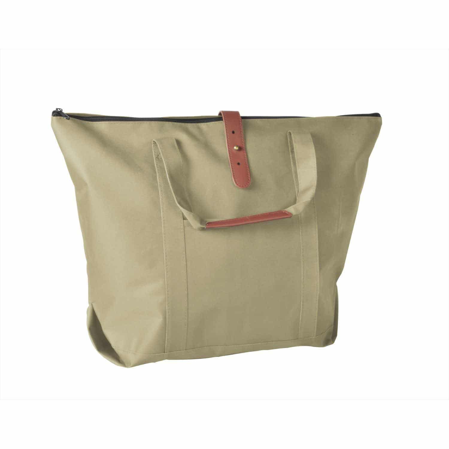 Mallard Tote featuring a zippered top, brass closure, front slip pocket, and PU accents. Complies with Prop 65. 21.75″ W x 15″ H x 7″ D